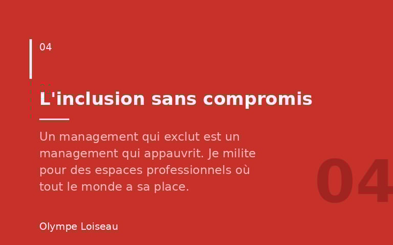 Je lutte activement contre la grossophobie — encore trop banalisée, trop minimisée, y compris en milieu professionnel. Je m'engage plus largement contre toutes les formes de discrimination et pour la promotion d'un management authentiquement inclusif.